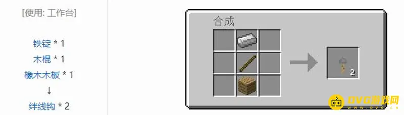 首先我们找到绊线钩的相关说明,然后就可以发现绊线钩的合成方法了,为用一个铁锭,一根木棍和一个木板就可以合成绊线钩了。