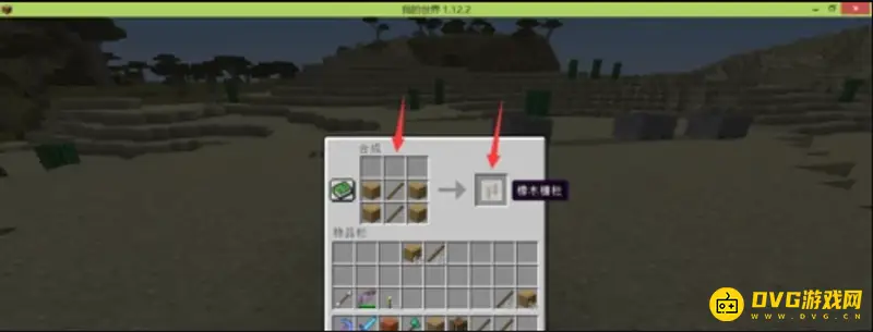 4.栅栏的合成方法:在工作台中,两边是两个木板各按列排放,中间2根木棍,竖着放。这样可以合成4个栅栏,需要大量栅栏按第三步的方法。