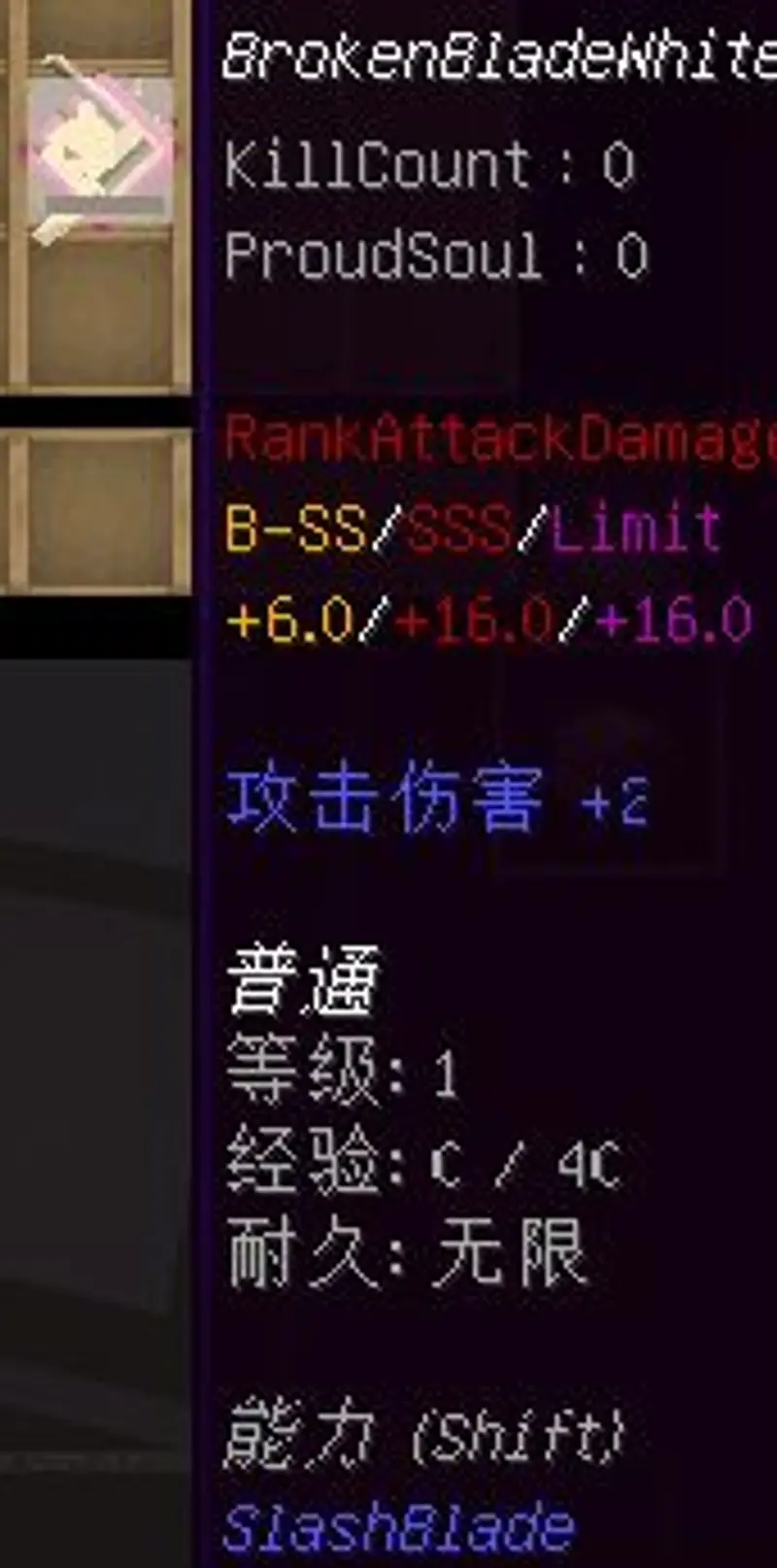 4用利刀「白鞘」杀怪一百只并用烂之后得到BrokenBladeWhite,也就是它的破损刀。(按照老办法,装有武器等级模组的要想弄烂刀,可以用刀左键砍树叶)