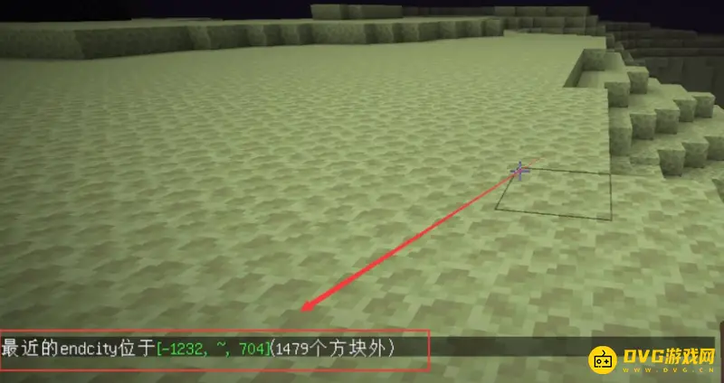 2.可以看到,此时会出现提示最近的末地城市方位,我们记住它后面的坐标,然后输入“/tp 坐标位置”。