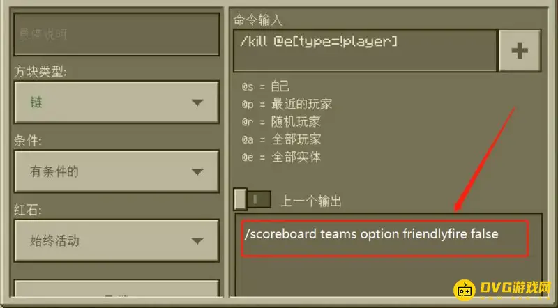 在我的世界单人模式中按T打开聊天框输入:/scoreboard teams option friendlyfire false,即可关闭队友伤害,如图所示,还有很多的指令是可以使用的,并且是有条件的,方块类型是链。