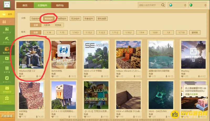 1,首先进入我的世界组件中心,点击上方的视觉组件,然后在下方选择一个光影进入。