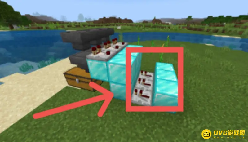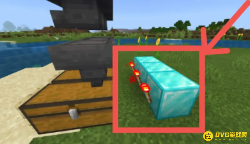 4、在普通的方块上放置红石火把,然后红石火把上再次放置一个普通的方块与红石比较器;