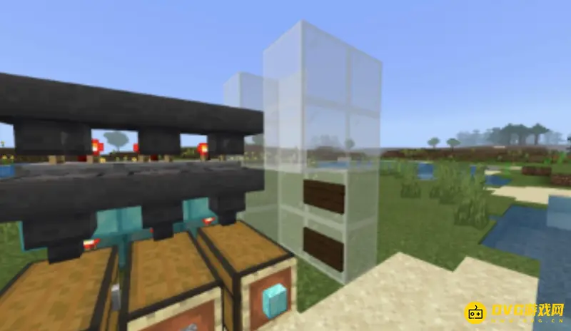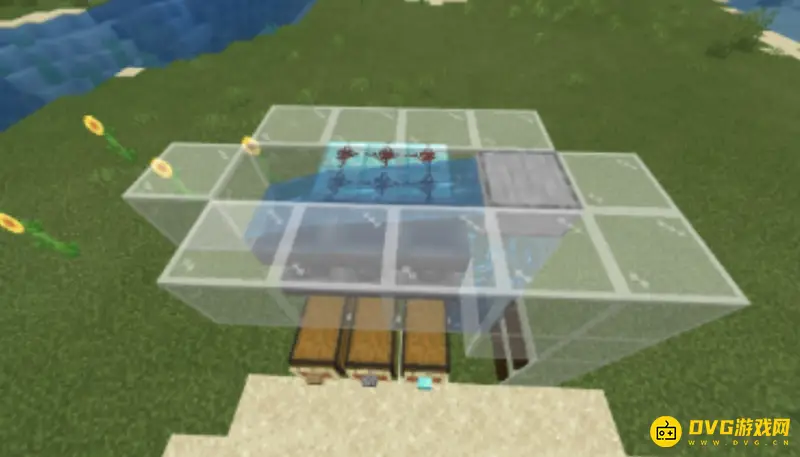 9、在玻璃管道内放置灵魂沙并在管道中倒水,最后在上层放置一个台阶并倒水;