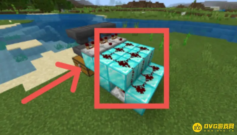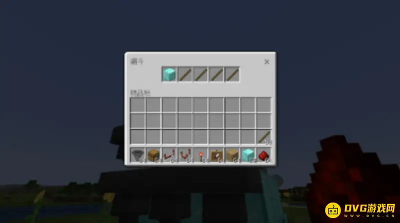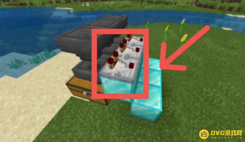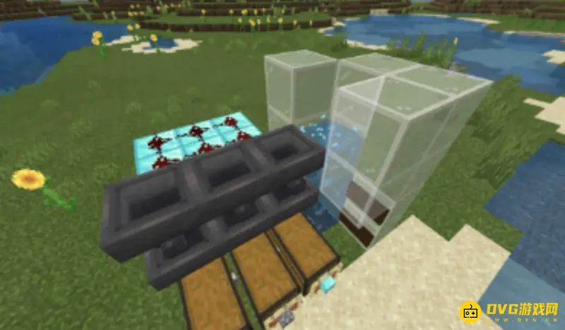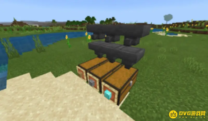 3、注意放置漏斗时,需要按住潜行键就才能放置,箱子的后方各一个格子放置普通的方块;