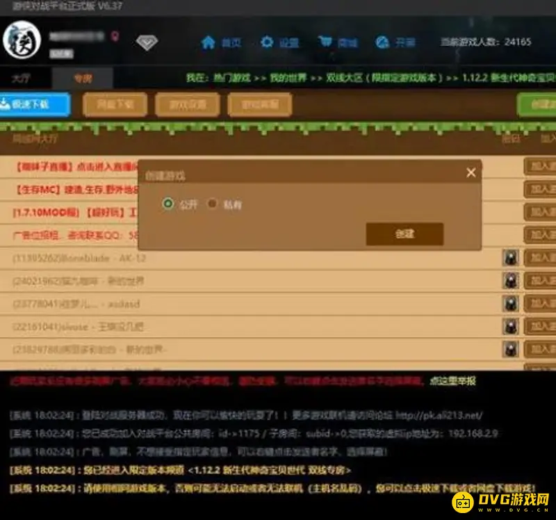 6.点击创建游戏,就会出现这个窗口有公开和私有,选择公开比较方便,你的朋友就不用输入密码就可以进入游戏,别人会因为整合包的不同进不来。
