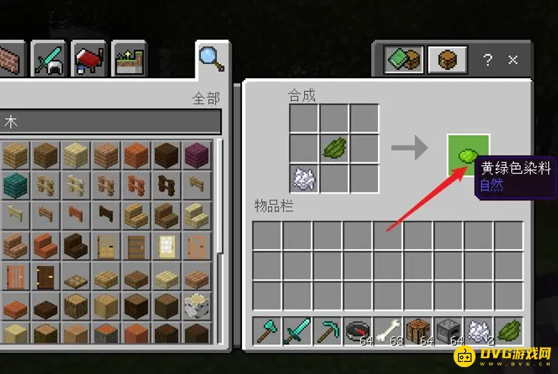 5.制作绿色染料:将1份骨粉和1份仙人掌绿放入工作台,制作绿色染料。