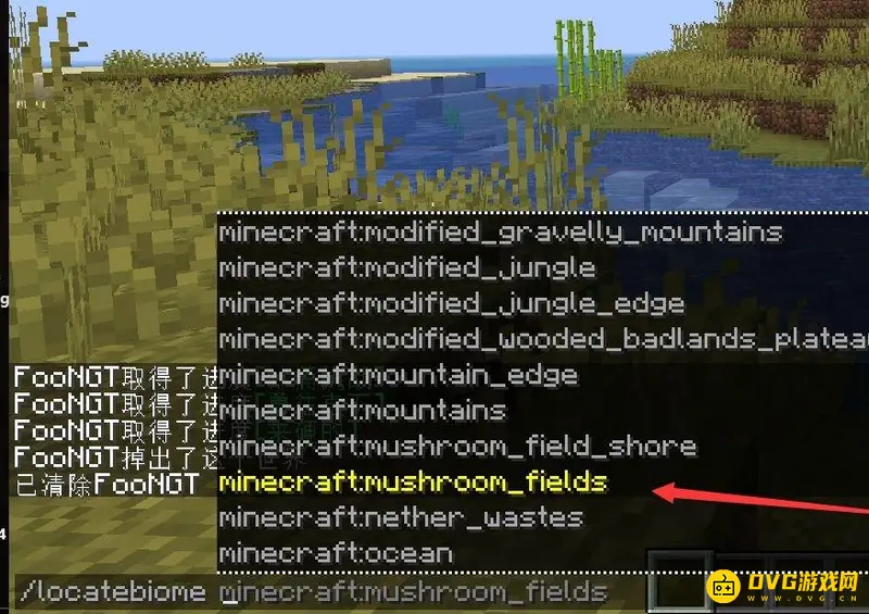 4、输入指令以后,我们按下空格键,会自动弹出地形的快速选择框,我们可以在选择框中选择自己想要前往的地形,这里选择的是蘑菇岛地形。