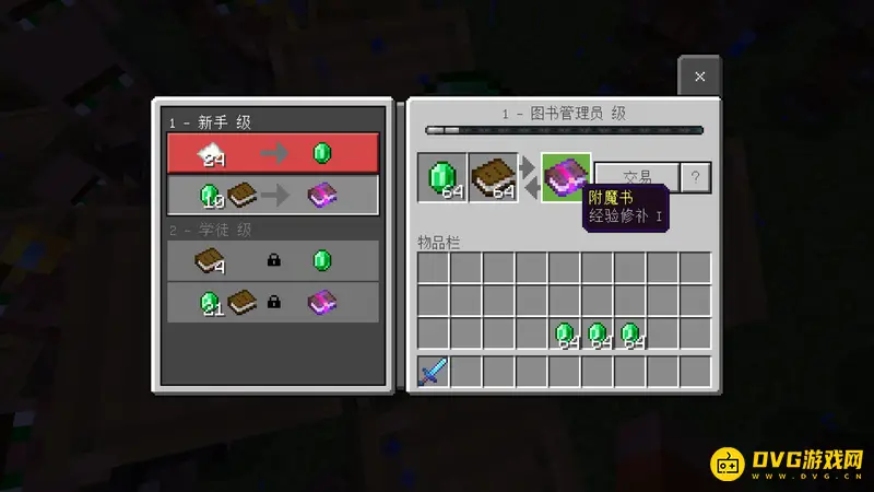 3.经验修补附魔书的获取方法:可通过与村民交易,向图书管理员村民购买,需准备绿宝石和书,卖经验修补附魔书的村民有几率会刷出,可通过反复摧毁和搭建他的职业方块,刷新村民的售卖物品。