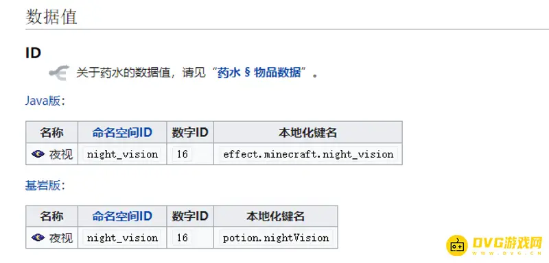 在游戏中,夜视效果指令其实是/effect 玩家ID 16 10000 255 true。在这条指令里面16就代表夜视效果(如下图),后面的数字就代表时间和效果等级。