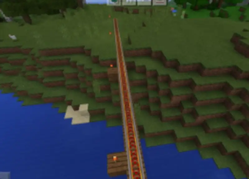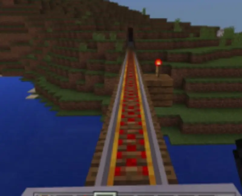 3、然后在动力铁轨的旁边,每隔一定距离就放置一个红石灯。