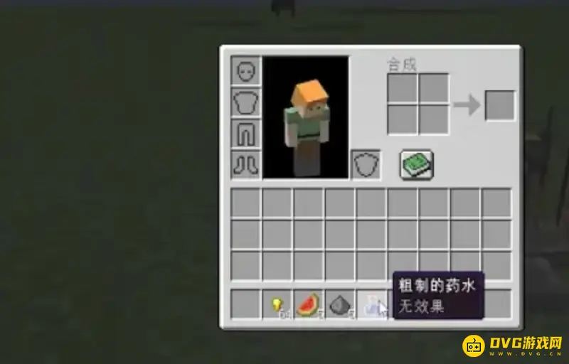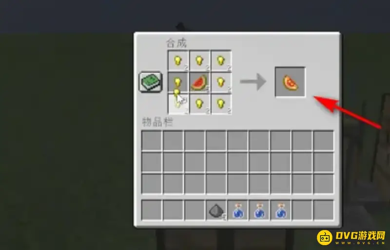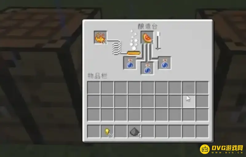 4、将烈焰粉、闪烁的西瓜、粗制的药水放入酿造台的合成框中。