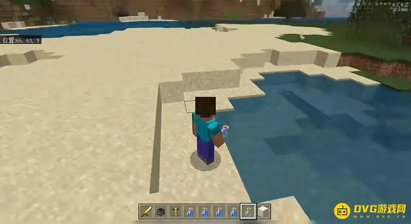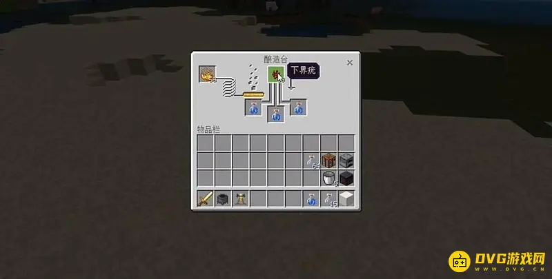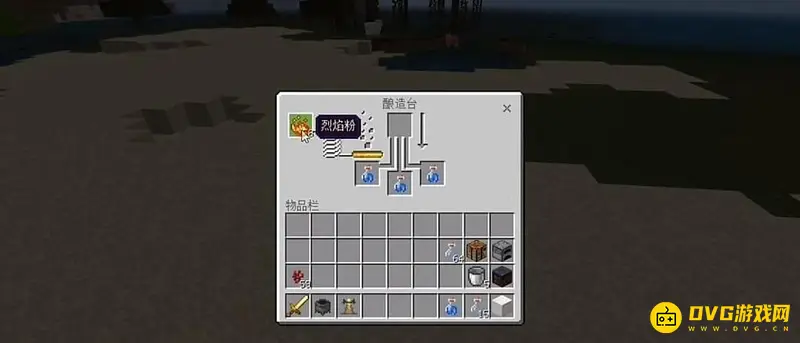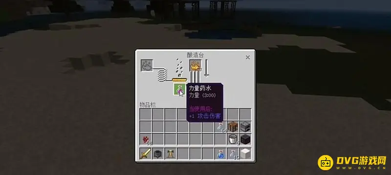 9.将下界疣取下后,将烈焰粉放到酿造台上方物品栏,粗制药水变成了”力量药水“。