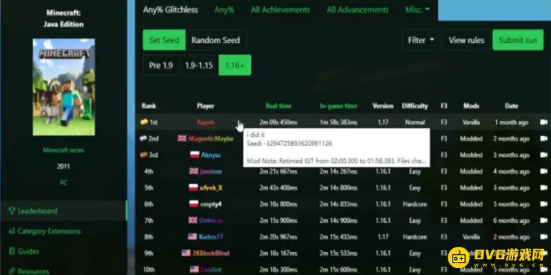 速通玩家Rayoh首次实现了在两分钟内通关《我的世界》的壮举。Rayoh通关用时1分58秒,创下了“禁用BUG且使用固定种子通关”项目,即“Set Seed Glitchless”(SSG)的世界纪录。