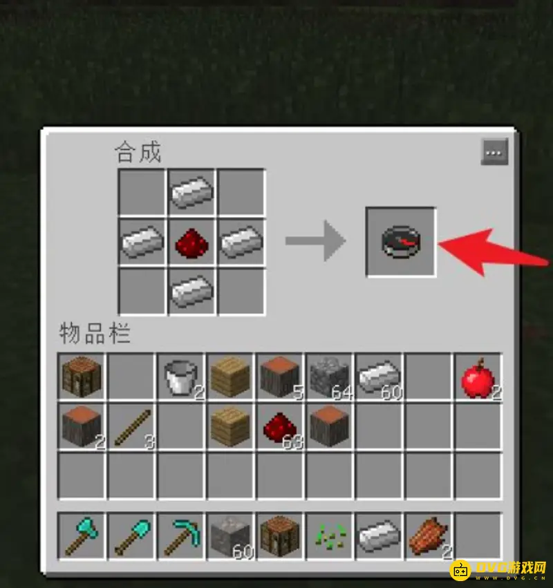 2.合成栏最中间放入红石粉,另四个位置放入铁锭,得到指南针。