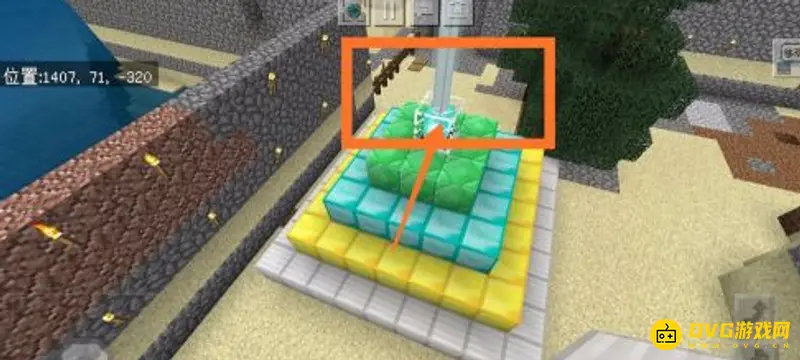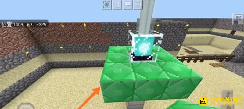 5.我们来到户外,首先使用铁块,将信标垫起四格高。然后叫兴标放在最上面,之后用绿宝石块做成一个3x3的基座