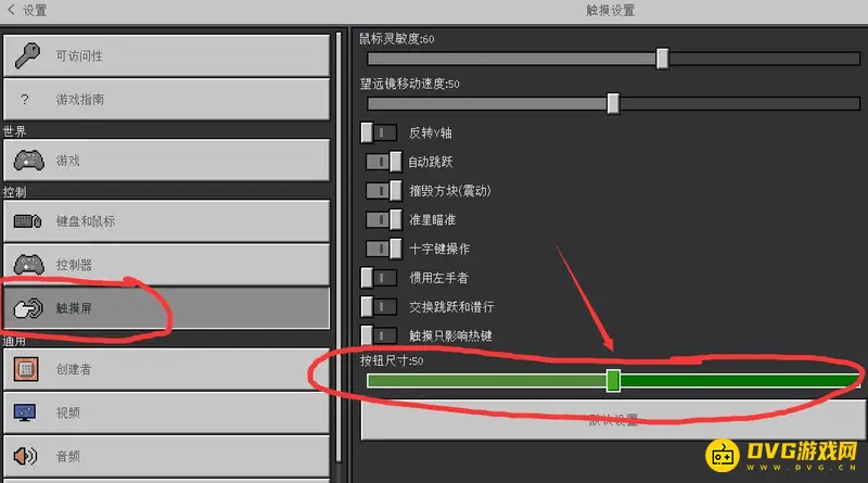 2,然后点击左侧触摸屏,就可以在右侧的按钮尺寸处调节按钮大小了,玩家往右拖动就能使按键变大。