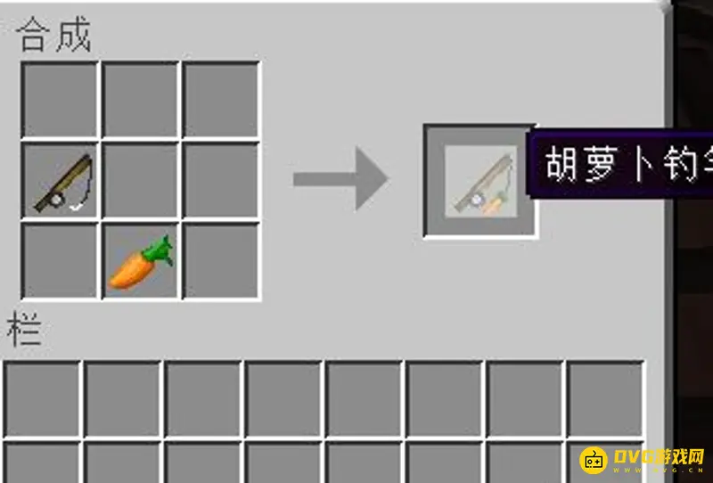 2.找到鞍之后,准备一根钓竿用来引诱猪,这里需要3个木棍和2个线和1个胡萝卜,一定要注意位置不要摆放错,胡萝卜要位于钓鱼竿的右下角。
