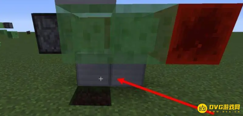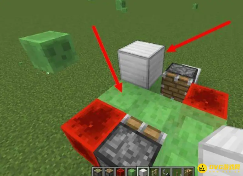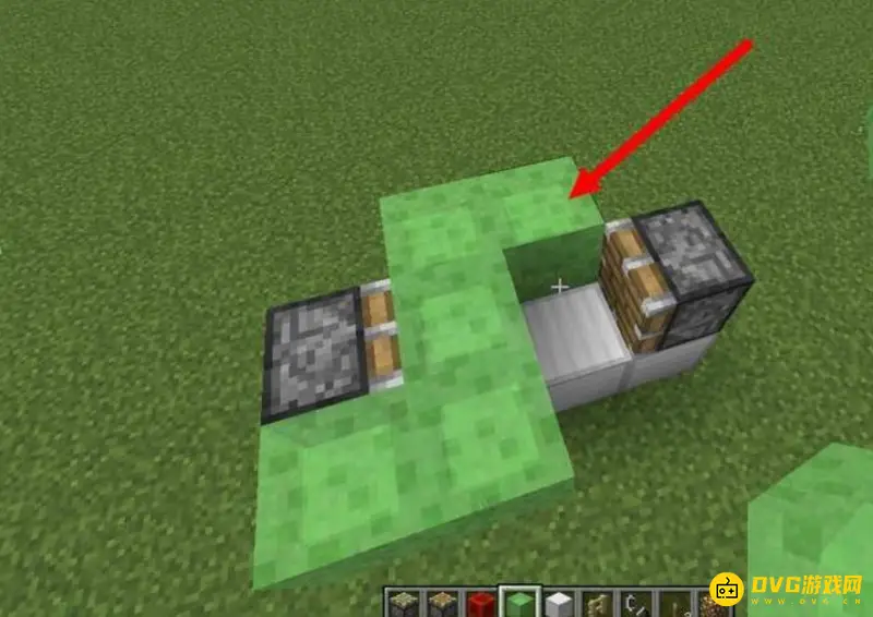 5、接着在上边靠近普通活塞的粘液块上放一个方块,这就是挡着你的,你就站在这个方块的前面,也就是箭头指的位置,这样车子就做好了。