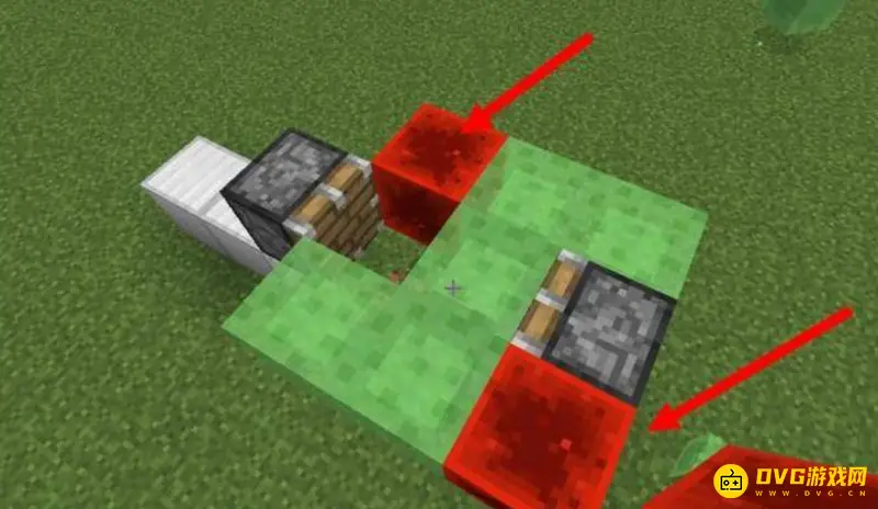 3、接着按图中的位置放上红石块,在放置粘性活塞旁边的红石块后,位置会向前移动一格