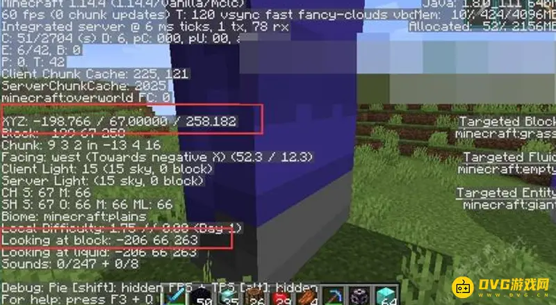 2、然后在游戏中按下F3后,就可以在界面上显示出包含玩家坐标的所有游戏信息,左侧[XYZ]显示的是玩家所在的坐标,下方[looking at block]显示的玩家鼠标指向的位置坐标。