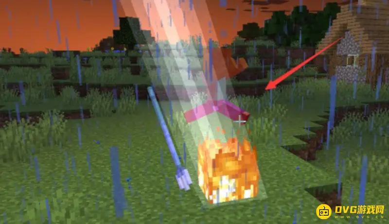 5、最后,我们对准想要攻击的怪物并按下右键扔出三叉戟,便会发现扔出的三叉戟触发了引雷的效果,并给予了怪物大量的伤害。