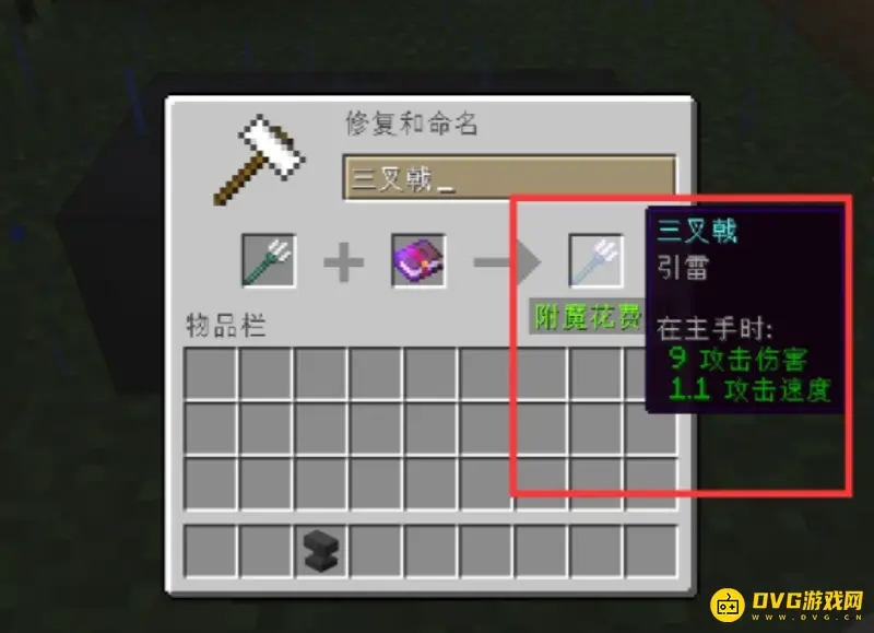 2、获得三叉戟以后,可以使用铁砧工具,将附魔书中的引雷属性赋予给三叉戟。