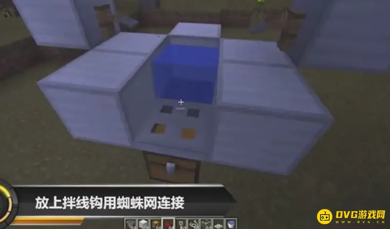5、中间放上拌线钩,再用一个蜘蛛网连接起来,再将一个方向铺一片钓鱼的区域,这样就可以自动钓鱼了,我们只需要按住鼠标右键不放就可以了,鱼没上钩是拉不回来的。