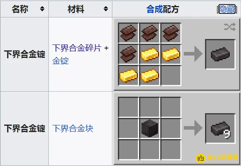 “下界合金”是通过下界合金碎片加金锭合成获得的,其中下界合金碎片需要通过烧炼远古残骸获得,金锭则需要通过熔炼金矿石获得。游戏中远古残骸在下界通常以矿脉的形式生成,每个区块最多会生成2个矿脉,可以使用钻石或更好的镐来开采远古残骸。
