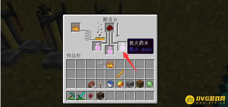 4、而3分钟的抗火对于玩家来说是远远不够的,所以需要将3分钟效果的抗火药剂放到有红石的酿造台中酿造,这样就可以将抗火药剂的有效时间提升到8分钟。