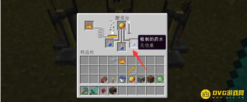 3、在放置地狱疣的酿造台的下方放上水瓶,可以制造出粗制的药水,在放置岩浆有的酿造台下方放粗制的药水后会产出3分钟效果的抗火药剂;
