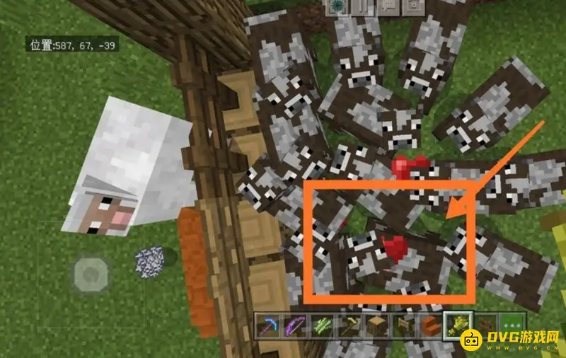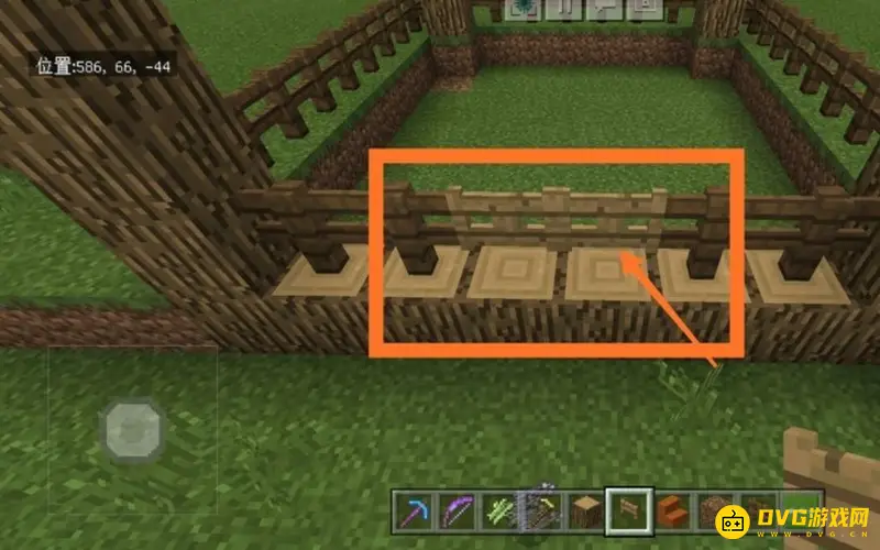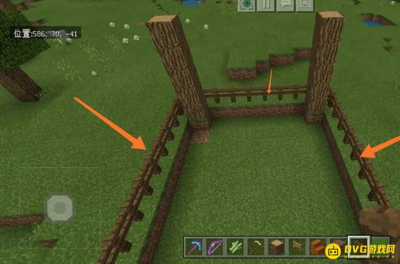 4、搭完柱子之后,我们拿出我们准备好的栅栏,然后在凹陷的边缘处搭建一层栅栏,这样就有两格高了,牛就不会逃出来。