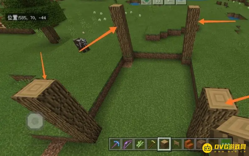 3、选好地址之后,我们拿出准备好的木块,然后搭建4个5格高的柱子。