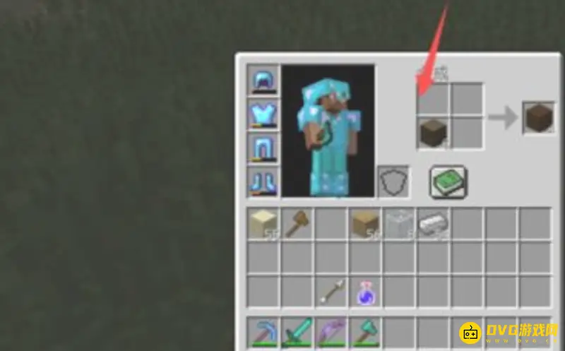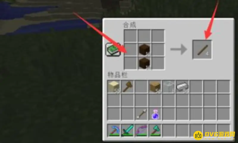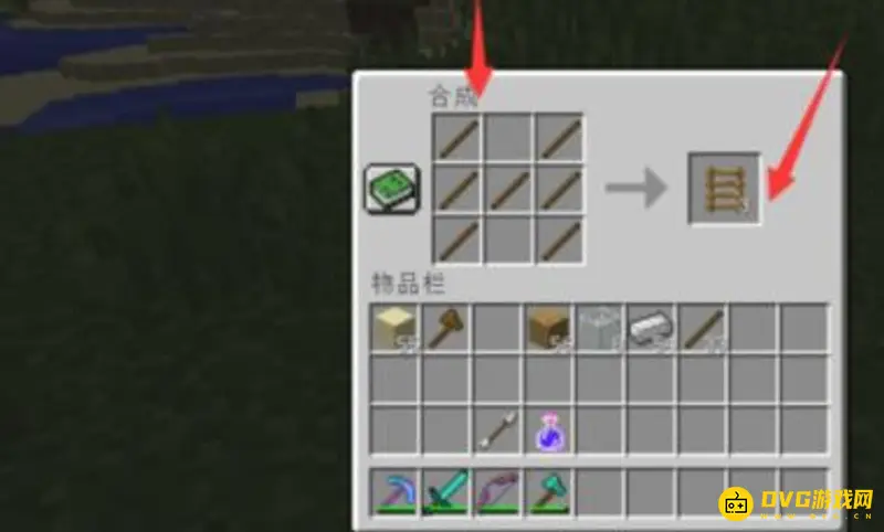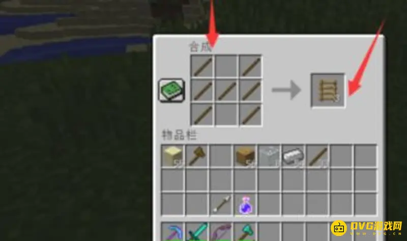 5.梯子的合成方法:将木棍放到工作台中,中间放一根,两边各放三根木棍,就可以合成梯子了。