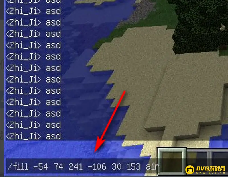 3、现在回到小岛上空,按下T打开对话框,输入/fill -54 74 241 -106 30 153 air。