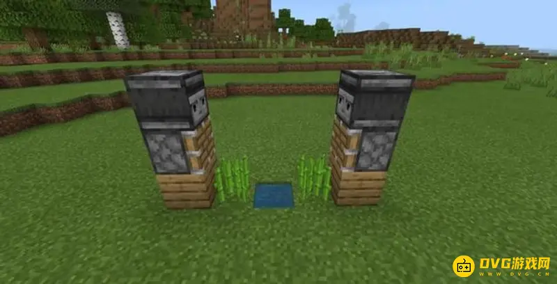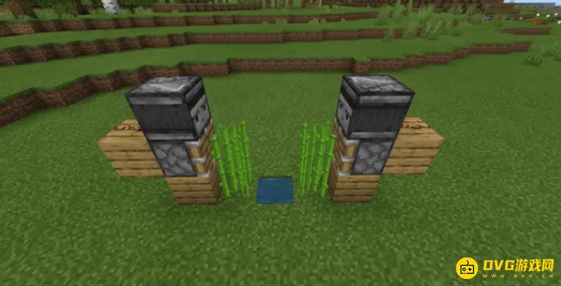 2.在甘蔗后面放任意方块,在该方块上面放置朝甘蔗方向的活塞,再在活塞上面放置“脸”朝甘蔗方向的侦测器