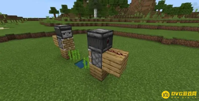 3.在活塞后面放置任意方块,方块上放置红石粉,这样一个全自动的甘蔗机就做好了