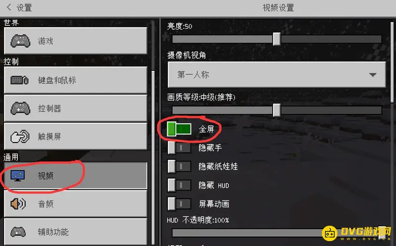 2,然后点击左侧的视频选项,把右侧的全屏打开即可。