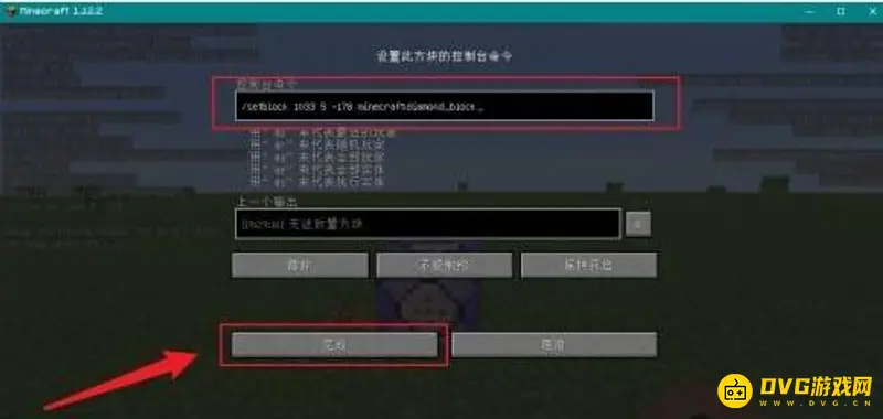 4.然后我们将指令 /setblock x y z block输入到命令方块之中,最后点击完成即可完成命令方块指令的设置。