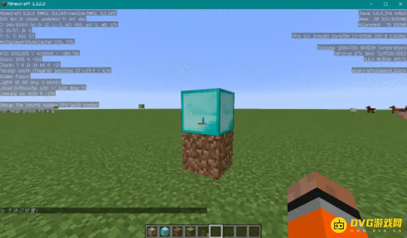 2.然后找到我们想循环刷新方块的位置,这个时候摁住“F3”键然后记下图中所示位置的坐标,可以将这个时候的坐标打在聊天栏中方便查找。