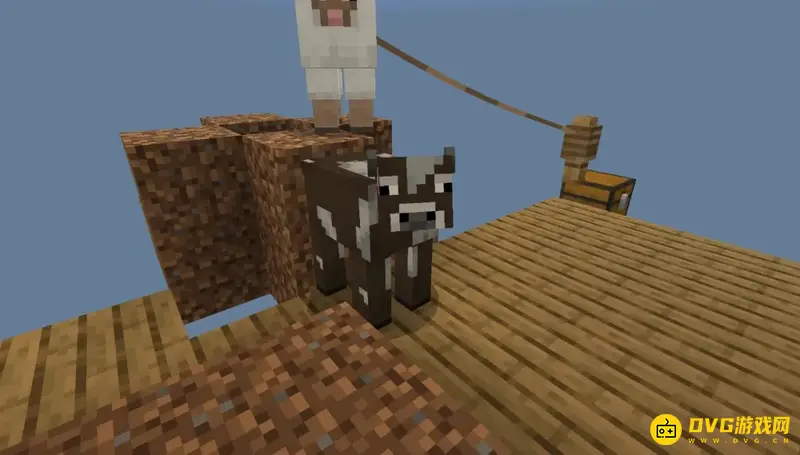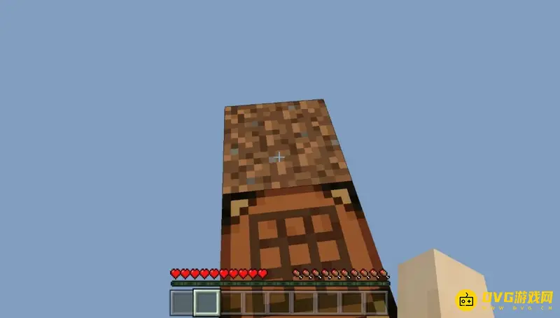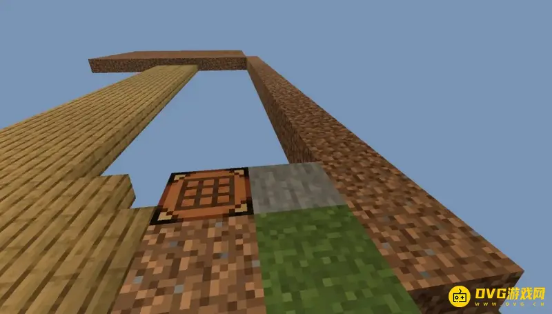 (4)将工作台放出来,就可以多一格可以踩的平台,如果你运气够好的话挖掉第一个方块就有可能获得战利品箱。