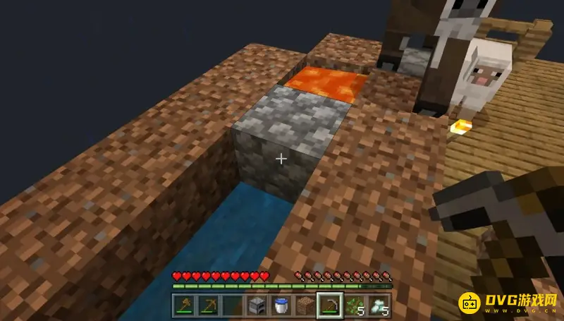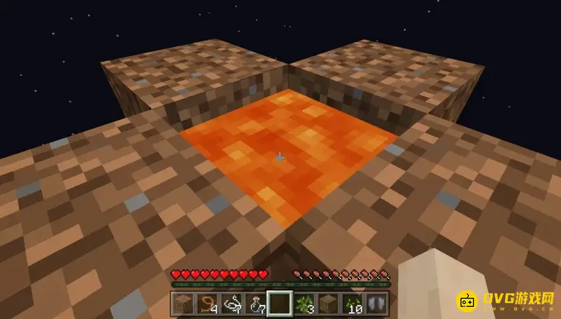 (3)这时天慢慢黑了,我们可以用泥土围上一圈,然后放一桶岩浆作为暂时的夜晚照明。