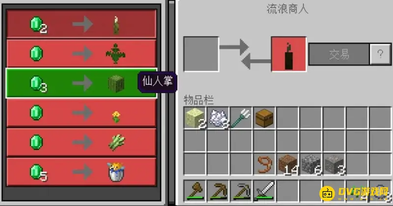 (3)根据基岩版的机制,当家里地盘大起来后,我们很快就会遇到流浪商人,在流浪商人这里,可以获得甘蔗和仙人掌,仙人掌特别有用,做出仙人掌机后,可以用仙人掌来刷经验,甘蔗和牛皮可以制成书,附魔台也能实现了,这里还有卖河豚,需要水的冒险家,河豚桶也能提供一格水哦~