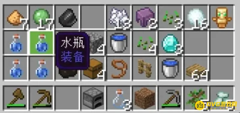 (5)如果想获得无限水,用水瓶对着水源接几瓶水,再将水瓶里的水倒进炼药锅,再用水桶接出来,这样就有无限水了,有了无限水后耕种也不是问题了。