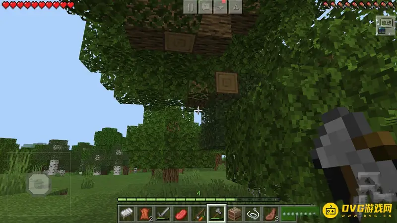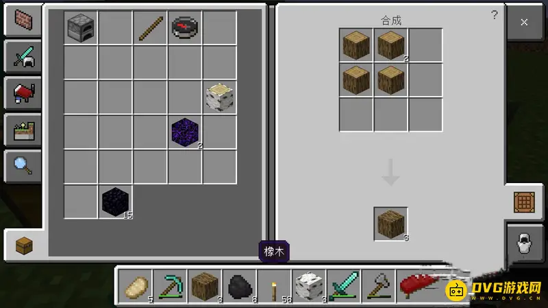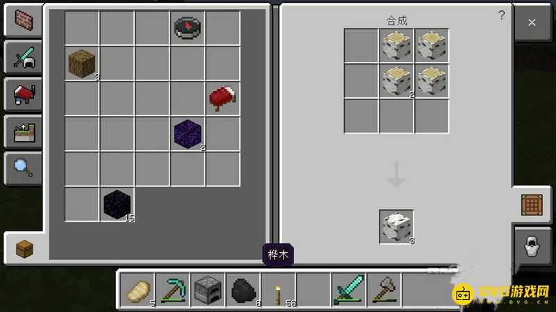 3、砍树获得木头后,到工作台里,在工作台左侧九宫格放4块木头,上下各两块木头,一定要对齐才能把木头去皮,如图所示