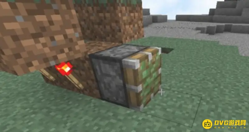 3、接下来在底下的两个方块两边各插入两根红石火把。在中间放上红石,在前面放一个拉杆。
