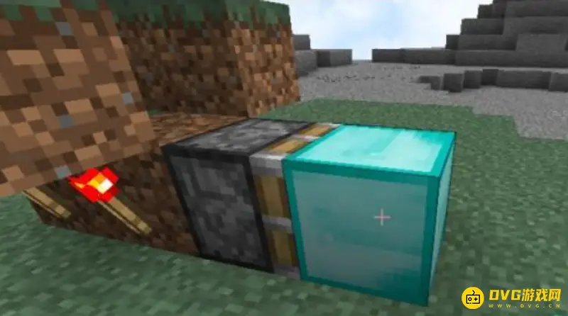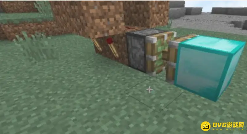 5、然后活塞前面放钻石,最后在中间的两块草皮上面放红石,就会发现活塞推着钻石疯狂的运转起来了。然后拿着草皮一直右击活塞旁边的方块即可。这样一个钻石机工作台就完成了。