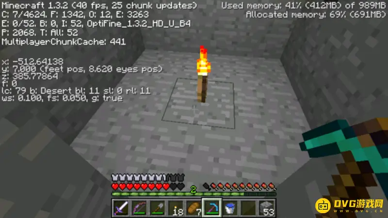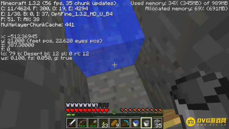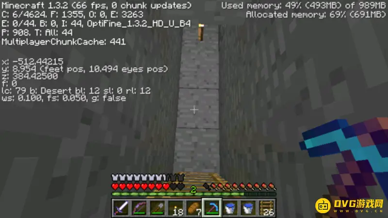 8、接下来在水流末端这里马克坐标。洞穴蜘蛛摔14格之后就只剩半格血,空手一击必死。于是就要一直垂直下挖到y=21-14=7