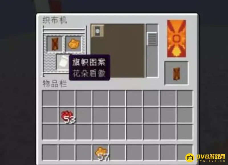 使用织布机把染上红波纹边、橙色自上渐淡、红色圆形、红斜十字、橙色花朵盾徽图案的黄色旗帜,染上红顶三角图案,这样就大功告成了。