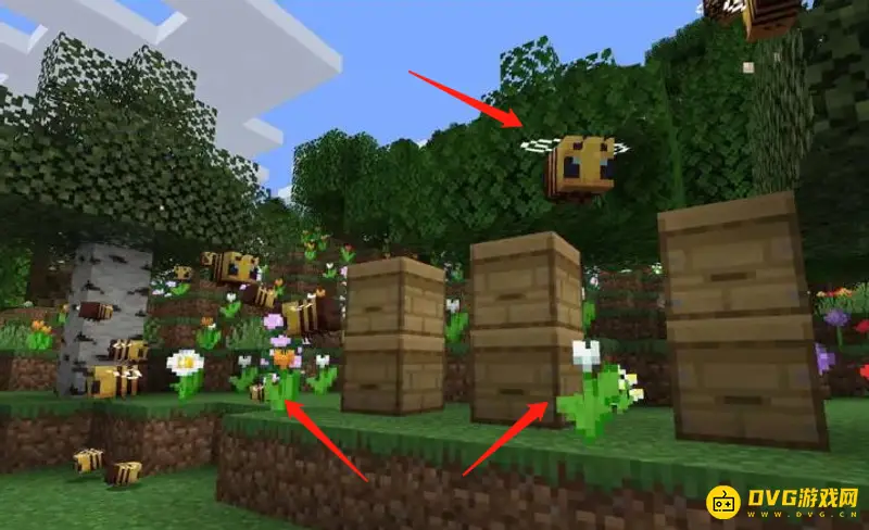 游戏我的世界中玩家可以采摘花朵吸引蜜蜂,蜜蜂看见了花就会自动跟随,或者玩家可以直接在蜂箱旁边种满花朵,等待一段时间,蜂箱中会自动出现蜜蜂。